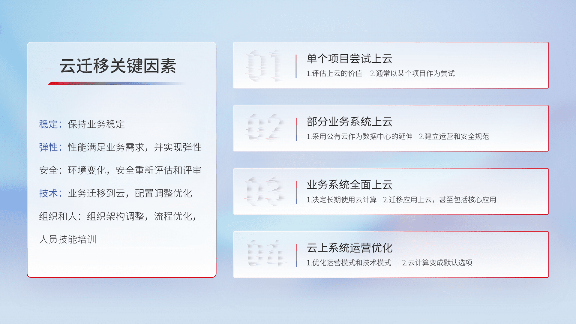 结合实际业务,,,从规划设计、、、云平台选型、、、、云原生改造、、数据迁移、、集成交付,,迁移全过程为客户识别最佳上云路径,,做好风险识别管理,,,设计网络架构、、、、身份权限、、、安全审计合规、、、操作审计、、、日志审计、、、监控告警策略、、多站点容灾设计等,,,对云上基础设施进行整体规划,,,,提升IT治理水平,,以满足弹性、、、、高可用、、高性能的需求。。