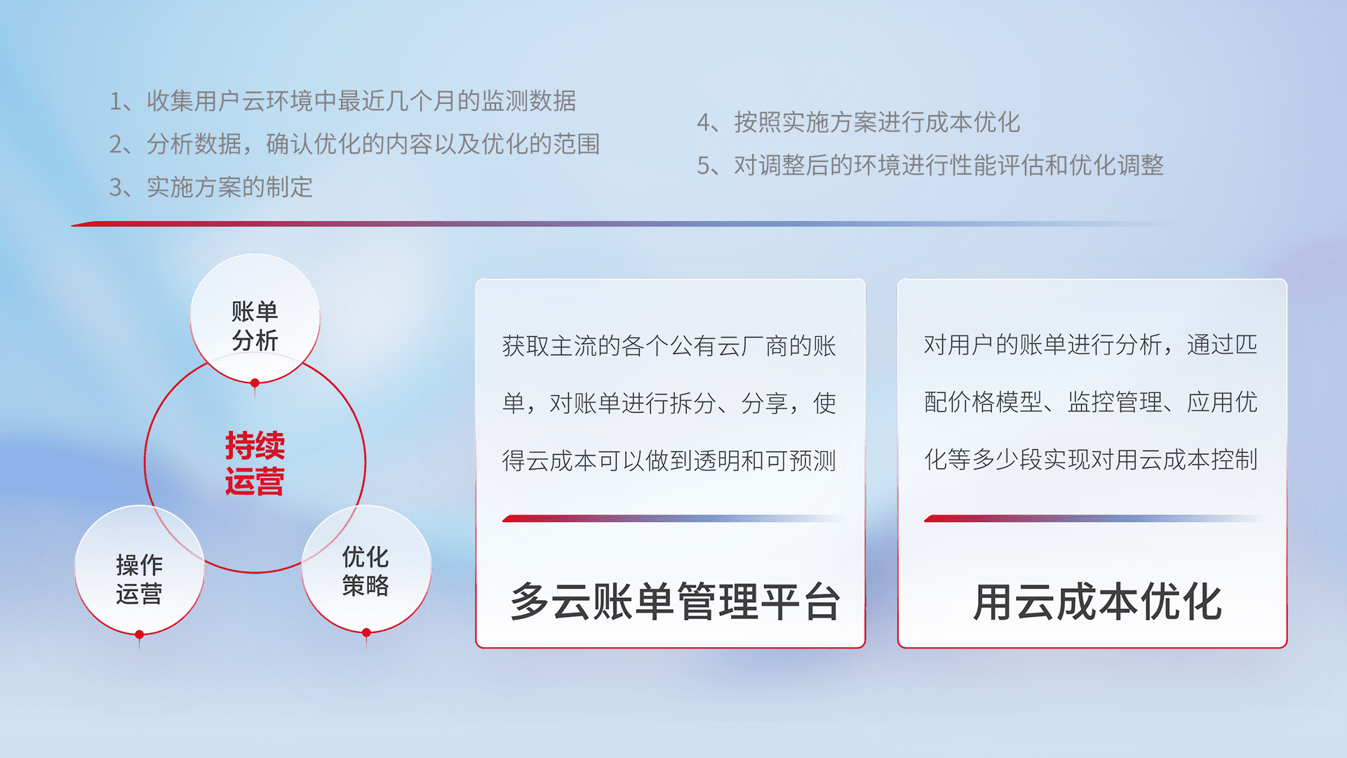 通过多云纳管,,以统一的资源数据模型把客户的云资源进行抽象和封装,,,进而实现对多云资源的统一操作,,,,保障云资源管理的可靠性、、、稳定性与可用性。。。量身定制化运维内容,,,配置、、、、开发运维、、补丁管理、、备份、、、、监控、、认证和访问管理、、审计和日常巡检等,,,,保障在用云过程中的可靠度,,,稳定度以及高可用率。。